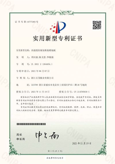 高強度防腐蝕集裝箱地板實用新型專利證書
