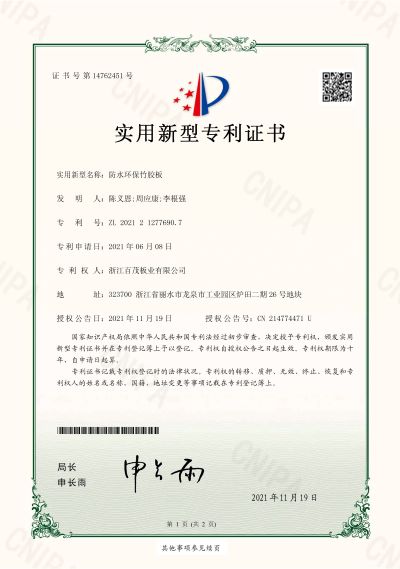 防水環保竹膠板實用新型專利證書